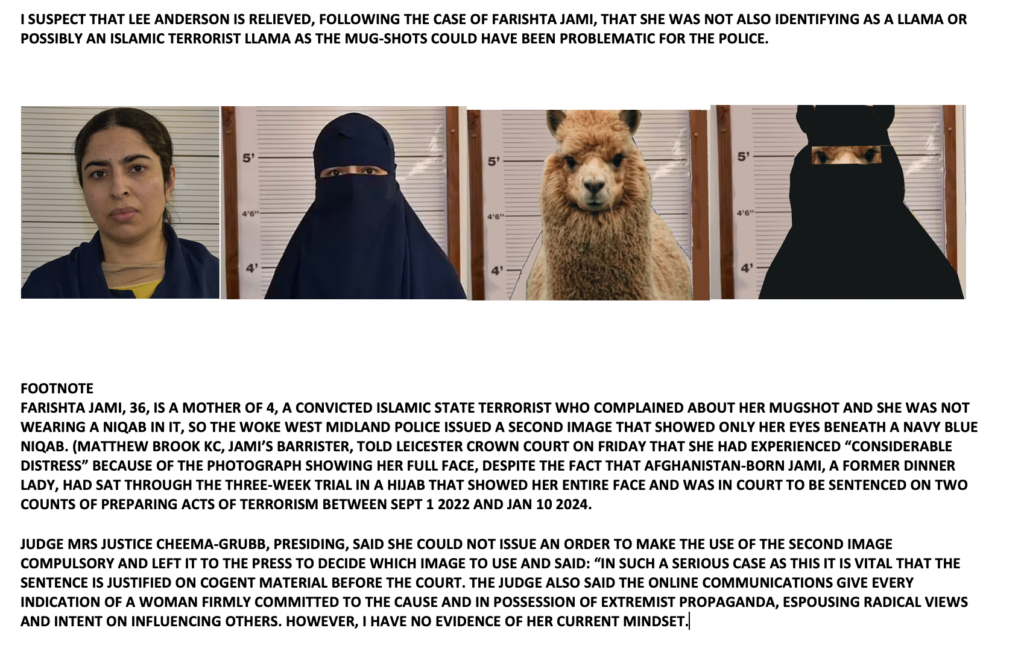 I suspect that Lee Anderson is relieved that Farishta Jani was not also identifying as a Llama or possibly an islamic terrorist llama as the mug-shots could have been very problematic for the police.